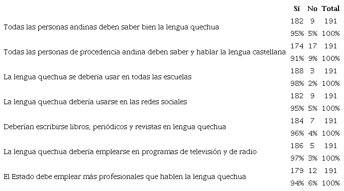 Las preguntas referidas en este punto aluden a situaciones deseables, futuristas, a un «deber ser», que generan respuestas que en la práctica colisionan con actitudes y conductas contradictorias. Así, expresaron que «todas las personan andinas deberían saber la lengua quechua (95%) y también la lengua castellana (91%)», aunque en la práctica no se advierte la transmisión intergeneracional de la lengua quechua; Del mismo modo, se señala que la lengua quechua debería emplearse en la escuela (98%), en las redes sociales (95%), en los periódicos y revistas (96%) y en la radio y televisión (97%).
