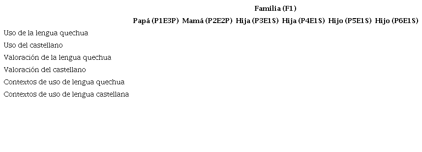 Con respecto a los instrumentos y su aplicación, los datos cuantitativos se procesaron en hojas de cálculo de Excel para exportarlos al programa SPSS. Consecuentemente, se buscó determinar las correlaciones correspondientes acordes con los objetivos del estudio. Considerando los datos registrados a través de la observación participativa, se evaluaron las actitudes de los participantes respecto de la lengua quechua y del castellano. Para ello, de forma complementaria, se organizó la observación en un cuadro codificado por familias, que se estructuró tomando como referencia cinco ejes, que resumimos en tres: