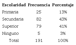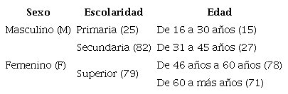 La población estuvo compuesta por 191 personas entre varones y mujeres. Los criterios de evaluación de la muestra se presentan en la Tabla 1. Los datos entre paréntesis corresponden al número de colaboradores de las variables edad y escolaridad.