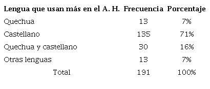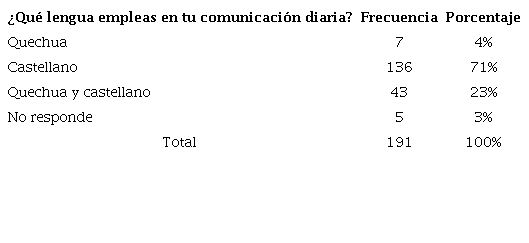 En cuanto a la pregunta acerca de la lengua que se emplea en la comunicación diaria (Tabla 7), la mayoría refirió que emplea el castellano (71%); un escaso número de personas admitió que emplea el quechua (4%); el porcentaje de personas que emplea el quechua y el castellano alternadamente fue de 23%.