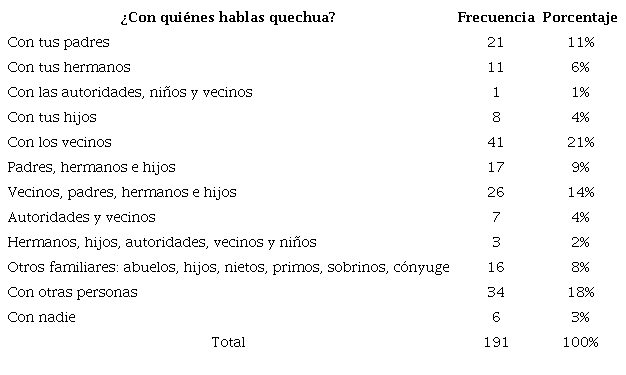 En cambio, debido a su disminuido estatus social, se reserva el empleo del quechua para situaciones comunicativas muy restringidas con los vecinos (21%), en la casa, en el entorno familiar íntimo, con los padres (11%) y hermanos mayores (6%) y con otras personas con quienes, por el nivel de confianza, se intercambia el discurso quechua (18%), lo que se presenta en la Tabla 5.