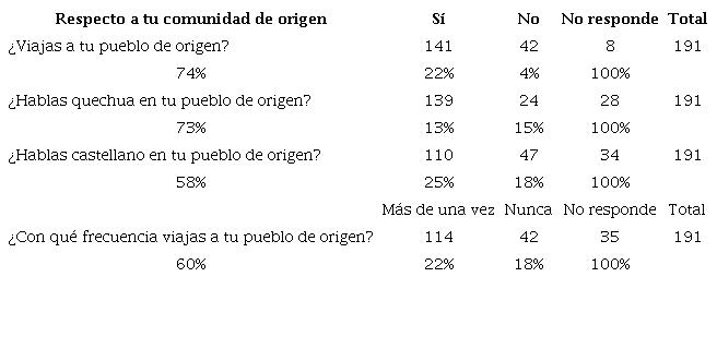 Con respecto a la utilización del quechua o el castellano en la comunidad de origen, la mayoría de los entrevistados (73%) refirió que habla quechua en su pueblo de origen; el 58% dijo que utiliza el castellano. Viajar al lugar de origen y hablar la lengua quechua en el contexto nativo logra mantener el sentimiento de fidelidad al grupo étnico; hablar el quechua consolida la relación entre la identidad lingüística y la identidad territorial (Gugenberger, 1999, p. 269). Los datos presentados indican que en la comunidad de origen se hablan las dos lenguas: castellano y quechua, con cierta preferencia por el quechua; la elección probablemente depende del tipo de interlocutor y del nivel de confianza entre los coterráneos. En la decisión de utilizar el quechua, se compromete cierta dosis de lealtad hacia la lengua nativa (Tabla 6).