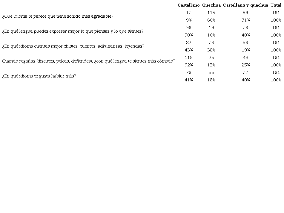 A la pregunta: ¿en qué lengua te gusta hablar más?, la cual tiene un carácter psicológico dirigido a revelar la afectividad por la lengua utilizada para desarrollar su actividad comunicativa, la respuesta mantuvo la situación de grupos contrariados. Por un lado, el 41% eligió el castellano, por otro lado, el 18% manifestó su afecto por el quechua. Otro grupo, al cual le es indiferente la elección, obtuvo la significativa proporción de 40%.