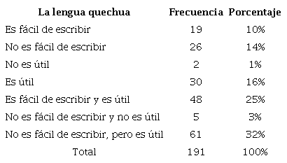 Como se aprecia, no hay consenso acerca de la facilidad o dificultad para la escritura del quechua. Esto puede deberse a la escasa promoción de su escritura en los entornos escolar y universitario, pero la utilidad o el valor funcional del quechua en sus funciones comunicativa y social dentro de la comunidad es indudable, por lo que los encuestados la valoraron significativamente (57%), en su totalidad. La lengua quechua pervive afectivamente en la conciencia de los hablantes.