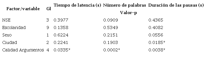 Con el fin de averiguar si las variables que caracterizan a los participantes (NSE, escolaridad, sexo, región de residencia y calidad de sus argumentos) afecta el comportamiento de las medidas que dan cuenta de la variable dependiente fluidez del habla (tiempo de latencia(s) entre el fin de la pregunta y el inicio de la intervención; número de palabras, y duración (s) de las pausas internas de cada intervención), se aplicó la prueba de Kruskal-Wallis. Los resultados se presentan en la Tabla 3.