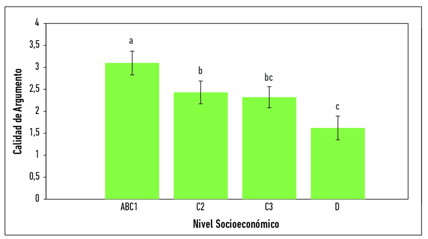 A mayor nivel socioeconómico, la calidad de los argumentos es mejor. El nivel socioeconómico está directamente relacionado con el nivel de educación: a mejor nivel socioeconómico, mayor nivel de educación (Rossell et al., 2017). De este modo, una mejor educación parece ser un factor importante en el desarrollo de las habilidades argumentativas. Este resultado confirma lo que se ha observado en otros estudios que han comparado la calidad argumentativa con el nivel socioeconómico, tanto en Chile (Santibáñez & Gascón, 2020) como en otras partes del mundo (Kuhn, 1991).