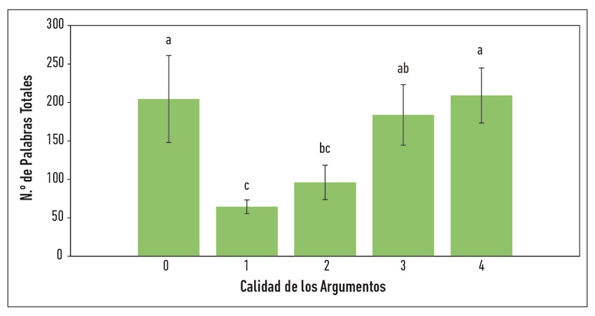 Si bien en la Tabla 3 se observa que existirían diferencias significativas entre el tiempo de latencia según la calidad de los argumentos (p=0.0334), el análisis de separación de medias de Wilcoxon no arrojó diferencias significativas en las latencias al contrastar los datos agrupados según la evaluación de la calidad de los argumentos (0-1-2-3-4 puntos). Sin embargo, el mismo análisis mostró que la calidad de los argumentos se asocia a diferencias significativas en el número de palabras. Los resultados se muestran en la Figura 2.