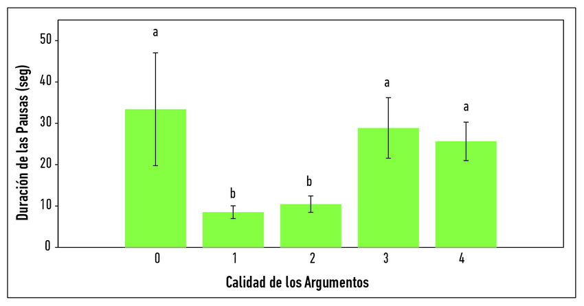 En cuanto al análisis del efecto de la calidad de los argumentos en la duración general de las pausas, considerando la suma del tiempo de latencia de la respuesta y las pausas al interior de la intervención, se encontraron diferencias significativas que se muestran en la Figura 3.