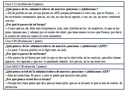 Sin argumentación comprensible. Se trata de aquellas razones insuficientes basadas únicamente en las experiencias personales del entrevistado, o en un único caso, o se referían a un tema no aludido en la consulta; por ejemplo: «El sistema de fondos de pensiones es muy malo, porque yo estoy recibiendo muy poco dinero».