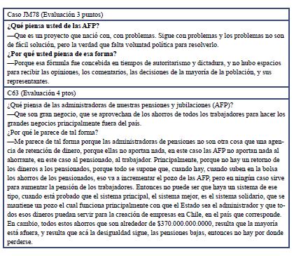 Como se aprecia en la Tabla 4, el primer caso (C13) fue valorado con 0, porque revela una incomprensión de lo consultado y una total falta de pertinencia del punto de vista expresado. La pregunta era relativa al sistema de fondos de retiro y la respuesta aborda el sistema de salud. Por lo tanto, alude a un tema no consultado en la pregunta. El caso C86 con 1 punto de valoración basa su argumento en una experiencia personal aceptable y creíble, pues presenta un argumento relevante al señalar que el sistema de pensiones para los adultos mayores resulta débil para responder a sus necesidades, pero la cantidad de razones es insuficiente. Por su parte, el caso evaluado con 2 (MM25), además de pertinente, es aceptable al ofrecer razones ampliamente conocidas. El caso JM78, valorado con 3 puntos, se basa en argumentos pertinentes y aceptables basados en el contexto histórico en el cual surge el sistema de pensiones. Finalmente, el caso C63, con 4 puntos, se caracteriza por ofrecer razones óptimas al apoyar su respuesta en razones externas a la experiencia personal y al describir la forma detallada cómo funciona el sistema de pensiones
