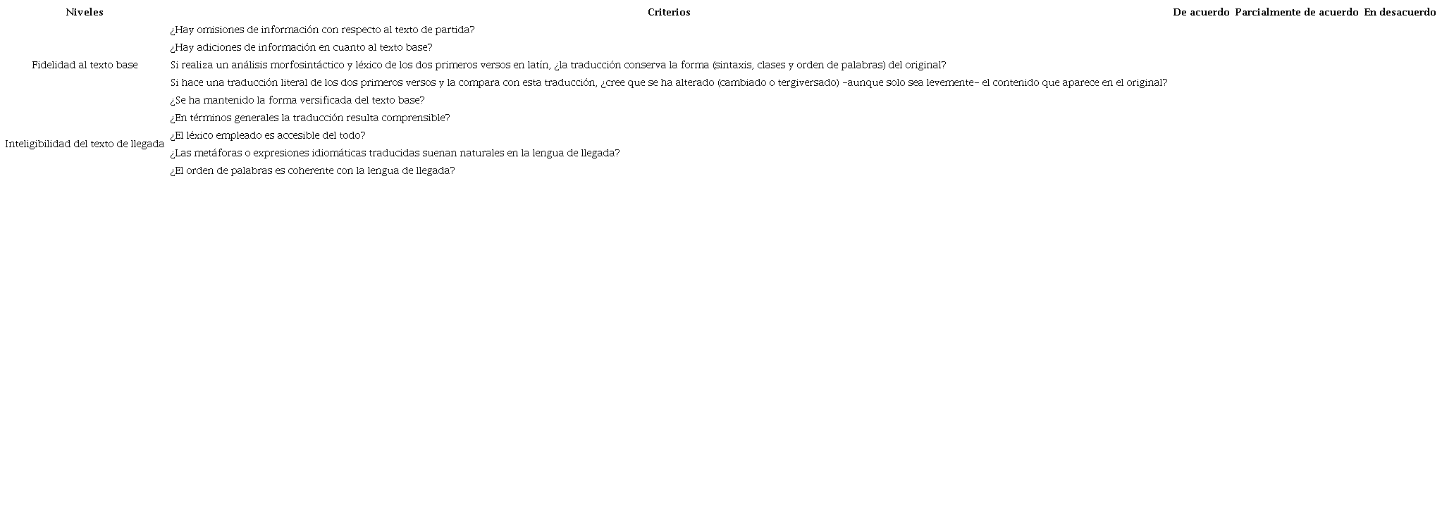 Por otra parte, para facilitar la selección de la traducción más apropiada para César, conviene ofrecer como material de apoyo una rúbrica, esto es, una serie de criterios que permitan evaluar en términos graduales tanto la fidelidad al texto base de cada traducción como la inteligibilidad del texto de llegada. En la Tabla 1, se presenta un posible modelo de rúbrica para cada traducción basada parcialmente en los trabajos ya citados en § 4.1.1. de Nida (2012) y Bolaños (2003)11:
