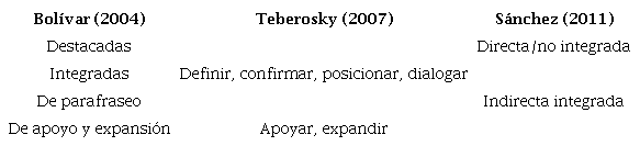 El sustento teórico del que se parte para guiar esta reflexión en torno al uso de citas consiste en el trabajo de Cisneros y Olave (2012) sobre la redacción y publicación de artículos científicos. Se retoma aquí su propuesta de cruce entre las tipologías de citas establecidas por Bolívar (2004), Teberosky (2007) y Sánchez (2011) en términos de ubicación, funcionalidad discursiva e integración de la cita, respectivamente. La Tabla 2 recoge de manera esquemática dicho cruce:
