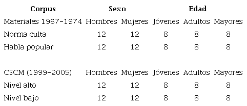 Tomando en cuenta lo anterior, para este estudio se retomaron tres corpus orales del español de la Ciudad de México; el primero, El habla de la ciudad de México. Materiales para su estudio (Lope Blanch, 1971), corresponde a la norma culta de hablantes con un nivel de instrucción alto, todos ellos, al menos, con estudios universitarios. Este corpus fue elaborado entre 1967 y 1971. El segundo, El habla popular de la ciudad de México. Materiales para su estudio (Lope Blanch, 1976), corresponde a hablantes con un nivel de instrucción bajo, analfabetos, con primaria trunca o concluida y hasta un año de secundaria. Este corpus fue elaborado entre los años 1972 y 1974. El tercer material, el Corpus Sociolingüístico de la Ciudad de México (CSCM, Martín Butragueño & Lastra [2011, 2012, 2015]), se compone de 108 entrevistas divididas en tres niveles de instrucción, alto, medio y bajo. Las entrevistas para este corpus fueron realizadas entre 1997 y 2007.