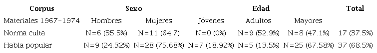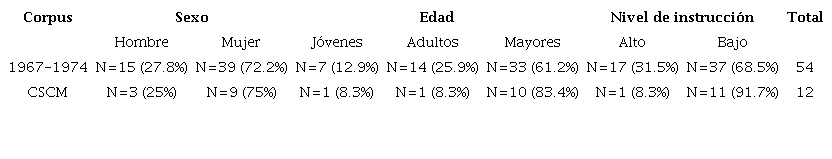 Ahora, cuando se consideran las variables sociales en su conjunto, se puede notar que las mujeres mayores con nivel de instrucción bajo son las que emplean más veces este marcador; en cambio, los hombres jóvenes de nivel alto presentan el comportamiento contrario. Como ya se estableció, el patrón mostrado por las mujeres es constante en las dos muestras, pero su uso es mayor en los materiales de 1967 y 1974. De la misma forma, se puede notar que la presencia de este marcador se vuelve más constante conforme el rango de edad va en aumento (jóvenes 8, adultos 15, mayores 43) y, por el contrario, su empleo disminuye cuando el nivel de instrucción aumenta. Estos resultados se muestran en la Tabla 5.
