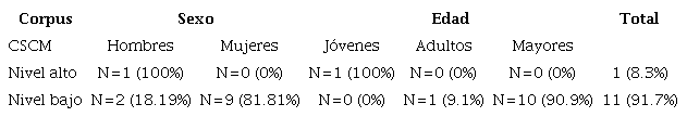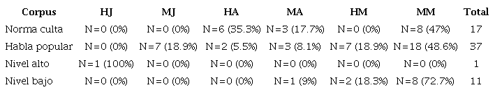 Por su parte, en los materiales actuales hay una ocurrencia bastante periférica de este marcador. En el nivel alto solo fue utilizado una vez, por un hombre joven. En cuanto al nivel bajo, apareció en 11 ocasiones, distribuido a lo largo de 5 entrevistas. Únicamente fue empleado por los adultos (1) y los mayores (10), mientras que las mujeres recurrieron a él 9 veces y los hombres 2. En concreto, las mujeres adultas lo emplearon 1 vez y las mayores 8 veces, en tanto que fue usado solo en 2 ocasiones por hombres mayores. Estos resultados se concentran en la Tabla 3.