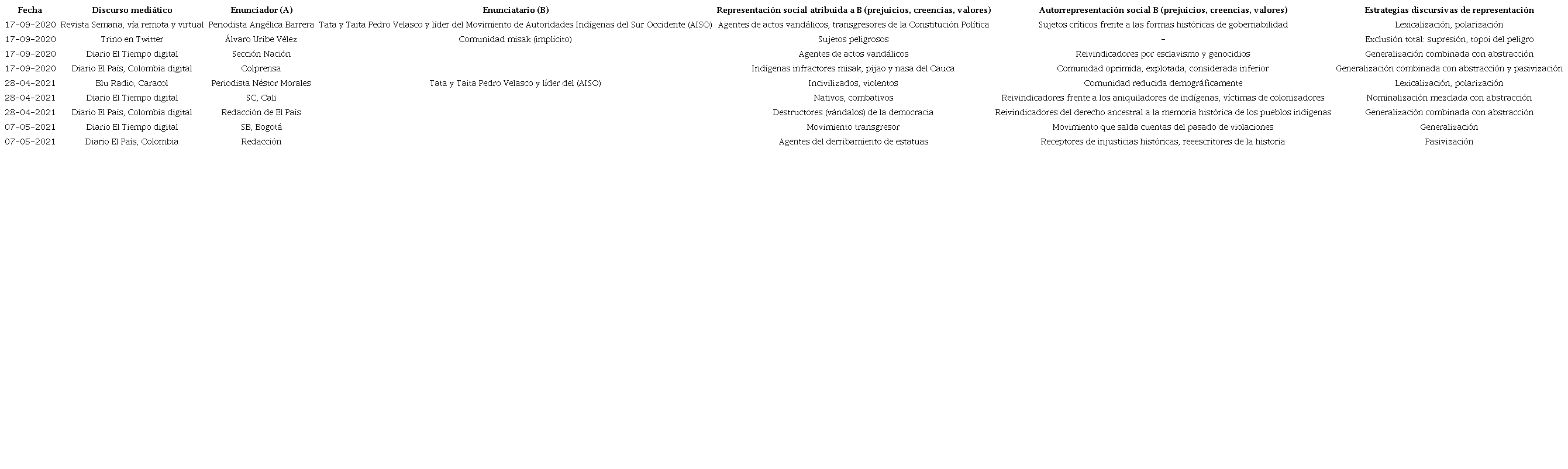 Pues bien, para analizar las maneras como se fundó la discriminación discursiva propia de la reconstrucción de los hechos afirmativos agenciados por integrantes de la comunidad misak frente a estos símbolos, se seleccionó parte del corpus recogido, a partir del juicio de representatividad de la muestra, no cribada mediante un muestreo casual, sino por medio de las expectativas generadas en el estudio frente a la aportación de ideas confirmatorias en relación con el objeto de estudio (Hernández, Fernández & Baptista, 1997), que en este caso fue la representación de minorías étnicas en un momento histórico (2020-2021). Ahora, para la discusión de resultados en este artículo, lo más representativo fue la selección del siguiente material informativo: