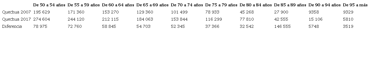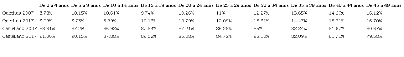 El porcentaje de hablantes de quechua el año 2017 disminuye en las generaciones más jóvenes y aumenta el de hablantes de castellano respecto a 2007. Así, si bien encontramos un descenso en dos puntos porcentuales de castellanohablantes en los resultados totales, si comparamos los resultados con el quechua, no se puede decir que haya un retroceso del castellano, sino todo lo contrario: en las generaciones más jóvenes, de cero a diez años, el porcentaje de personas que tienen el quechua como lengua materna (L1) disminuye respecto a 2007 y aumenta el del castellano. Es decir, si comparamos los datos de los últimos 10 años (el tiempo entre los dos censos), el quechua disminuye tanto en los números absolutos (370 928 personas hablantes de quechua de 0 a 9 años en 2007 vs. 240 677 en 2017) como en los relativos (18.93% de quechuahablantes 0 a 9 años en 2007 vs. 12.82% en 2017).