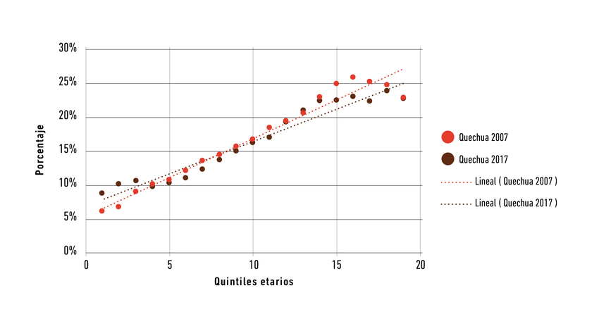 Vemos que el porcentaje de hablantes de L1 quechua es más elevado en los grupos más adultos; por ejemplo, en los datos del censo del 2017, entre las personas de 95 años a más, el porcentaje de hablantes de lengua materna quechua es de 26.54%, frente al 69.74% que tienen como lengua materna el castellano (más de la cuarta parte de los hablantes de 95 años a más tiene en el quechua su L1), mientras que el porcentaje de castellano como lengua materna en la población de 0 a 4 años es 91.36%, frente al 6.09% que habla quechua como L1 (la dieciseisava parte de la población de cero a cuatro años tiene el quechua como L1). En esta primera generación hay una baja de dos puntos porcentuales y en el quintil siguiente, la disminución del quechua entre personas con lengua materna quechua en diez años es de 3.42%. Al hacer la separación por quintiles, se observan las mismas tendencias en 2007 y 2017, aunque más pronunciadas en las generaciones de 0 a 10 años.