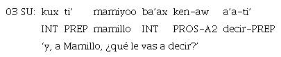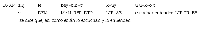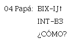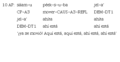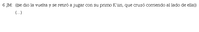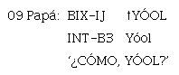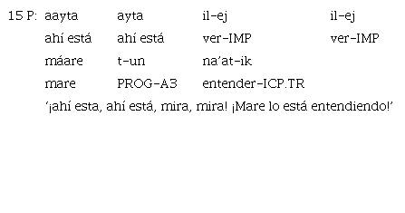 Cuando los hijos de esta familia logran adquirir la lengua maya, al igual que el español, entre los 3 y 3.5 años, los padres, la abuela y los propios hijos se vuelven guardianes e inspectores eternos del uso activo de la lengua maya por los hijos y con los hijos, en las organizaciones de sus actividades sociales. De manera constante, tanto los padres como la abuela y los propios hijos cuidan el uso equilibrado del español y la lengua maya por los niños. Cuando los niños empiezan a usar más el español en sus interacciones comunicativas entre ellos y con los demás hablantes de la lengua maya, los padres, la abuela y los propios hijos se organizan para regresar el uso de la lengua maya, mediante reparos en los turnos del habla, que se realizan con directivos: «ich maya» ‘en maya’, y peticiones: «¿bixij?» ‘¿cómo?’, lo cual damos a conocer en el ejemplo 5.