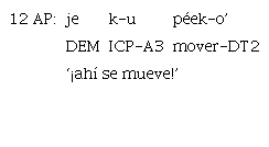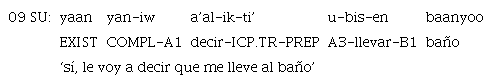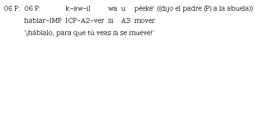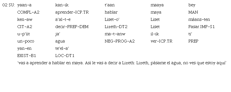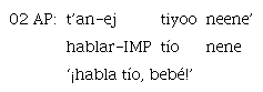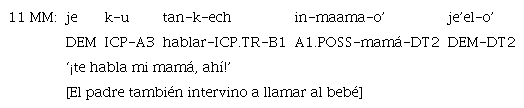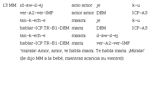 Como se nota en ejemplo 1, en esta familia los nuevos hablantes de la lengua maya inician con su proceso de socialización lingüística antes del nacimiento, porque los padres y los demás miembros de la familia integran a la criatura como interlocutor «participante» (De León, 2005) en las interacciones comunicativas que celebran con y sobre el niño. En esta etapa, los socializadores y los socializados prenatales hacen uso de un lenguaje multimodal conformado principalmente por la lengua maya, el español y los movimientos del bebé en gestación. Como es evidente, se privilegia mayormente el maya yucateco, por encima del español, en las «rutinas de interacción con el niño» (Peters & Boggs, 1986).
