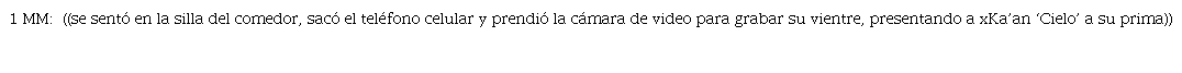 Los padres y los demás integrantes de la familia tienen bien claro que los hijos deben de hablar las dos lenguas que hablan los miembros de la familia. Por eso la ejecución de las políticas lingüísticas del uso de la lengua maya y el español con los hijos inician desde cuando el nuevo hablante de la lengua se encuentra en gestación. Es decir, durante el embarazo, la madre, la abuela, el padre, los hermanos y los tíos, hablan y conversan con la criatura en las dos lenguas de la familia, a través de una plataforma de comunicación multimodal, como se ve en el ejemplo 1.