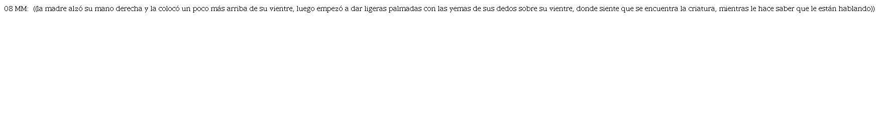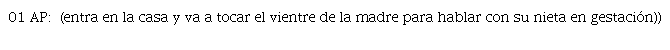 La abuela Paulina (AP) llega a visitar a su hija María (MM), mamá embarazada de 34 años, que se encuentra sentada en una hamaca colorida en un rincón de la casa. Cuando la abuela entra a la casa con su hijo Gamaliel (TG) va directo a tocar el vientre de la madre y habla al bebé de 39 semanas de gestación para pedirle que salude a su tío, que llegó con ella en la visita.
