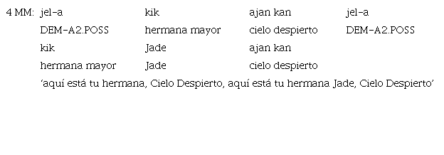 Tres años después del nacimiento del segundo hijo, el 23 de septiembre de 2019, se supo de la existencia de Yutsil (la última integrante de la familia, de 23 meses). Desde ese momento todos los miembros de la familia: los dos hermanos y los padres, empezaron a buscarle un primer nombre. En mutuo acuerdo decidieron llamarla «xKa’an» ‘Cielo’. Durante el embarazo, «xKa’an» vivió una vida de interacciones comunicativas al igual que su hermano «K’iin» ‘Sol’ en el ejemplo 1. Su inclusión como «participante» en las conversaciones familiares fue de constante a permanente, tanto en la recepción de las visitas como en la presentación de sus familiares.