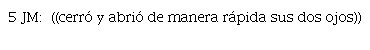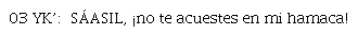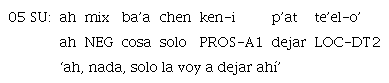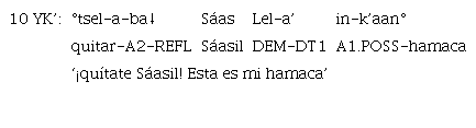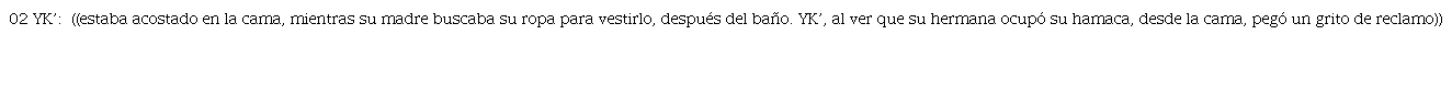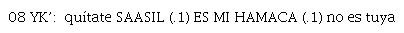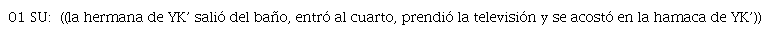 En el ejemplo 5, se presenta una disputa celebrada por los dos hijos mayores de la familia. Ambos son hablantes del maya yucateco y del español y fueron planificados para hablar el maya yucateco entre ellos; sin embargo, en esta disputa el uso lingüístico de los hijos no es el esperado, por lo que el padre interrumpe los turnos de habla para hacer que los hijos hablen en la lengua maya. El objeto de la disputa de los niños es la hamaca colgada en el centro de la casa para ver la televisión. La hamaca pertenece a Yóol K’iin (YK’), sin embargo, puede ser ocupada por otra persona si YK’ no se encuentra acostado en ella.