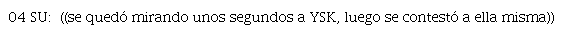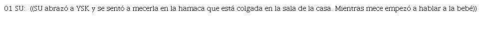 Después de tres semanas de nacida la última integrante de la familia (YSK), cuando ya podía levantar y sostener la cabeza, parte de su cuidado pasó a manos de su hermana mayor (SU). El uso lingüístico de la familia se mantuvo igual con la mayor exposición de la lengua maya a la recién nacida, porque la hermana incrementó la incitación de YSK al habla maya; enamorándola a hablar y dándole ella misma su propia voz, para visualizarle a YSK cómo va a ser su conversación en maya con sus primas maya hablantes de la comunidad de origen de su padre, Naranjal Poniente.