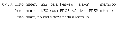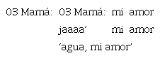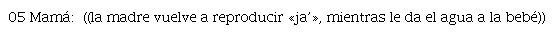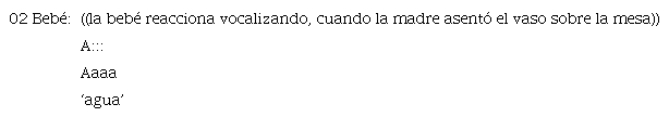 De acuerdo con Boas (1889, citado en Duranti [2011]), nadie es inmune a la influencia de su lengua materna o su segunda lengua en los sonidos que escucha de otros idiomas o de otros hablantes. Y se puede ser aún menos inmune ante los sonidos y los usos de la lengua cuando la lengua en cuestión es la que se busca transmitir de manera consciente y planificada en la socialización de las nuevas generaciones. Como nos demuestra la madre en este evento (ejemplo 4), donde la bebé vocaliza «Aaaa», en 02, y la madre escucha «ja’», un léxico del maya yucateco para la palabra ‘agua’, en el español. En este sentido, podemos ver que la lengua maya yucateca ha moldeado la forma en que piensan, hablan, actúan y se organizan en sus actividades sociales los miembros de esta familia para seguir manteniéndola en la familia.