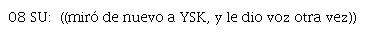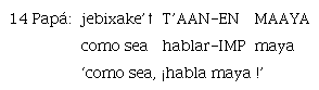 Como se mencionó antes, la política lingüística del mantenimiento del maya yucateco en esta familia no termina cuando los hijos logran adquirir la lengua. Por el contrario, la labor de los padres con el cuidado de la lengua maya se intensifica aún más, ya que tienen que vigilar que los hijos hablen la lengua maya entre ellos y con los demás hablantes del maya yucateco. Como se nota en las líneas 03, 04 y 05, cuando el niño YK’, en línea 03, se dirige a su hermana SU en español, el padre, en 04 interrumpe en maya: «BIXIJ» ‘¿cómo?’, para hacer que el niño se dirija en maya a su hermana, lo cual se realiza en la línea 05. De la misma forma, se exhibe la misma acción de reparo a favor de la lengua maya en las líneas 08, 09 y 10. En este sentido, los padres no se conforman con que los hijos sepan hablar la lengua maya, sino que buscan que la lengua se mantenga viva mediante su uso constante por todos sus hablantes en la familia, de acuerdo con los hechos registrados en la línea 11 a la 15.