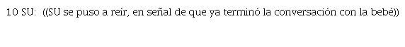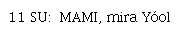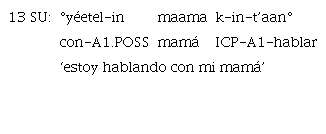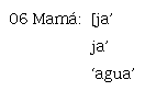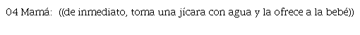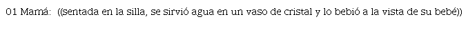 En el siguiente suceso, participa una madre maya de 38 años, bilingüe (L1: español; L2: Maya), una bebé de 6 meses de edad, en etapa de vocalización y balbuceo, expuesta al input del maya yucateco y del español. La madre aprendió a hablar el maya yucateco 10 años atrás, y se encuentra socializando a su bebé tanto el maya como el español. En este evento, teniendo la posibilidad de escuchar sonidos del español, por ser su lengua materna, la madre percibió de la vocalización de su bebé un léxico del maya yucateco, relacionado con el acto de beber agua, el cual repitió varias veces a su bebé para pedirle que la reprodujera.
