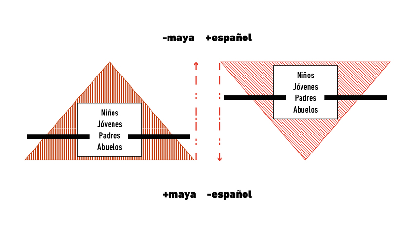 En la mayoría de las familias mayas, el uso de la lengua maya y el español en las interacciones comunicativas constituye pirámides invertidas, como se muestra en la Figura 1.