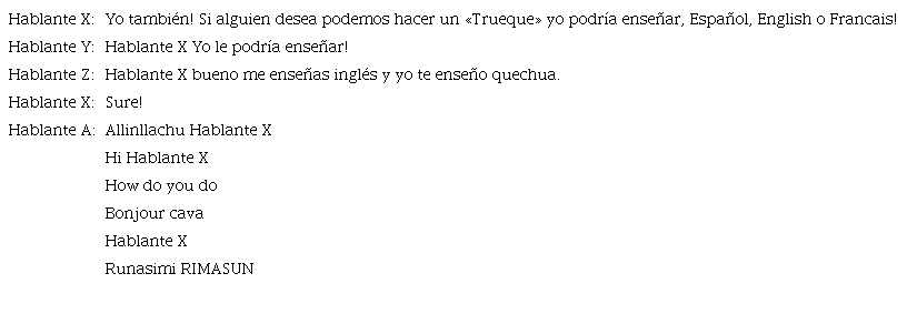 Al inicio, los comentarios que suceden al del Hablante X reproducen la ideología antes mencionada, que enfatiza saber quechua e inglés como dos competencias que se excluyen: «enséñame inglés y yo te enseño quechua». Sin embargo, luego otro participante subvierte esta ideología cuando habla simultáneamente en quechua, inglés y francés. Este ejemplo muestra el mismo patrón del anterior, pues los participantes que desafían la ideología dominante despliegan una representación en la que los que hablan quechua también saben inglés (y francés) y, por lo tanto, su quechua constituiría un recurso con valor. A partir de este acto, los participantes de ambos ejemplos proyectan una ciudadanía multilingüe donde saber quechua se resignifica en términos positivos.