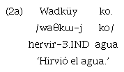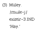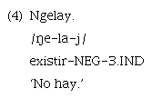Respecto de la alternancia de tipo léxico, se puede ejemplificar con el cambio que experimenta la raíz «/mɯle/» ‘existir, haber’, cuando se adjunta al morfema de negación «-/la/». En este caso, dicha raíz adquiere la forma (supletiva) «/ŋe/», con el mismo significado, tal como se observa en los siguientes ejemplos 3 y 4: