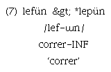 Las alternancias morfofonológicas son fenómenos específicos, cuyo efecto puede verse restringido a algunos ambientes derivados, y no ser válido para todos (Haspelmath & Sims, 2010). Efectivamente, como puede verse en los ejemplos 5 y 6 para el Criterio 1, en ambientes fonológicos similares no se produce el efecto. De igual modo, el segmento fricativo labiodental áfono en un radical como el que ocurre en el ejemplo 7 no se realiza como una oclusiva ante un morfema flexivo.