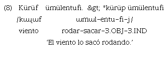 Las alternancias morfofonológicas no se producen en fronteras de palabras (Haspelmath & Sims, 2010). Es lo que sucede en el caso de la alternancia que provoca el sufijo «-(ü)m», pues esta causativización se configura dentro de la palabra fonológica y debido a esta distribución, no es posible que ocurra en fronteras léxicas6. Para mayor abundamiento, en el ejemplo 8 se aprecia que en un contexto fonológico-segmental similar al de la sufijación del morfema «-(ü)m», pero en frontera léxica, tras una raíz terminada en /f/, no se provoca el cambio en el radical (nominal en este caso), lo que sí se esperaría si la alternancia fuese automática.