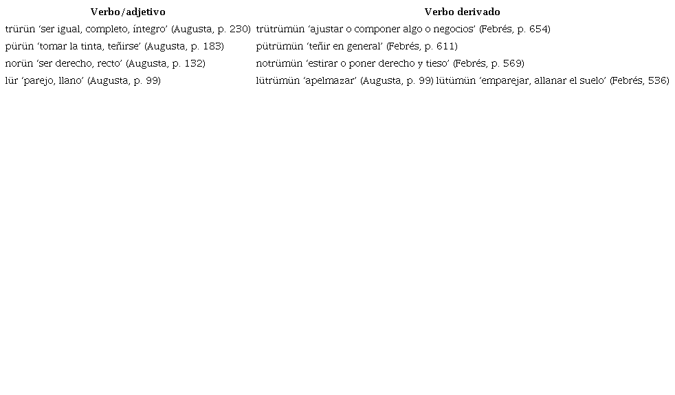 Por otro lado, también habría que considerar el hecho de que en Augusta (2017 [1916]) existe una forma intransitiva con el segmento africado retroflejo áfono: «lütrü-n» ([lɯ.ˈʈ͡ʂɯn]) (p. 99), lo que hace dudoso que se trate efectivamente del mismo verbo. Una explicación posible es que se trata de una derivación por analogía, donde la forma «lütrümün» ([lɯ.ʈ͡ʂɯ.ˈmɯn]) pierde el causativo, de lo que resulta el intransitivo «lütrü-n» (p. 99). Esto se refuerza por el hecho de que en las fuentes misionales no se encontró el vocablo «lütrün». A pesar de estas reservas, se prefirió mantenerlo como un posible ejemplo de esta alternancia, puesto que sus significados son similares («lür» ‘llano’ y «lütrümün» ‘emparejar y allanar’). Finalmente, llama la atención que el radical en Febrés (1764) se realiza con un segmento oclusivo alveolar «lùtumn» ([lɯ.ˈtu.mɯn]) (p. 536), y no con un segmento oclusivo retroflejo, lo cual también puede atribuirse al fenómeno de fluctuación fonemática ya mencionado anteriormente. En Augusta (2017 [1916]), en cambio, ocurre el segmento expectable africado retroflejo: «lütrümün» ([lɯ.ʈ͡ʂɯ.ˈmɯn]) (p. 99).