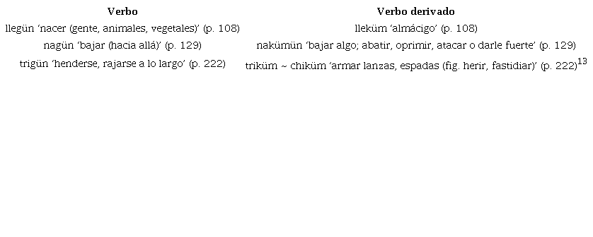 Tanto Febrés (1764) como Augusta (2017 [1916]) registran la forma causativa con un cambio morfofonológico de la consonante final de la raíz: «nothùmn» ([no.ˈʈɯ.mɯn]) y «notrümuwün» ([no.ʈ͡ʂɯ.mu.ˈwɯn]), respectivamente. De igual modo, ambas obras registran dos lexemas, uno con la alternancia y otro sin ella, con significados similares, lo que nos evoca los dobletes léxicos de radicales con consonantes velares, antes señalados en la Tabla 3.