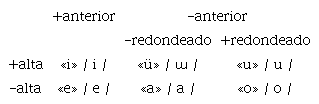 Tal como se presenta en la Tabla 1, los fonemas vocálicos del mapudungun son 6 y se distinguen de manera binaria por los rasgos de altura, anterioridad y redondez labial.