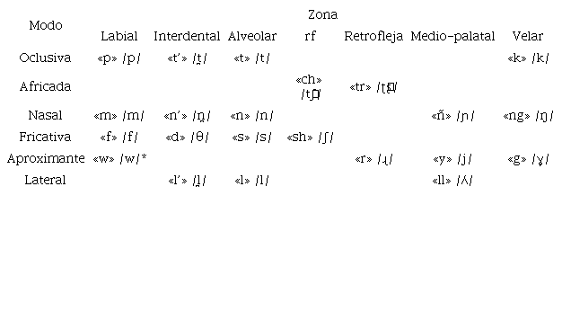 Por su parte, aunque existen algunos segmentos de estatus controversial, los fonemas consonánticos del mapudungun, habitualmente señalados por la literatura, son los que se presentan en la Tabla 2.