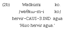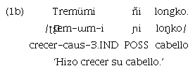 Un causativo es un morfema que permite cambiar la estructura semántica de un verbo, agregando un nuevo participante que tiene rol de agente causador (Haspelmath & Sims, 2010). Este agente pasa a ser referido en la estructura verbal, lo que en mapudungun equivale a tener el rol sintáctico de sujeto. En esta lengua se han identificado dos sufijos causativos: «-(ü)m» y «-(ü/e)l». La forma del sufijo «-(ü)m» tiene dos realizaciones alomórficas: «-üm» (con epéntesis de la sexta vocal), tras raíces que terminan en consonante; y «-m» tras raíces terminadas en vocal. En los ejemplos 1a y 2a se presentan enunciados con raíces verbales terminadas en C y V, respectivamente; y en los ejemplos 1b y 2b se presentan los alomorfos causativos señalados: