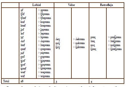 Como se observa, el número de alternancias es mucho más frecuente para el caso de los radicales terminados en el fonema labiodental (el cual cambia a bilabial), con 18 pares de verbos. En el caso del fonema velar, solo se registran tres casos, uno de ellos identificado durante nuestra pesquisa y no mencionado en la literatura sobre el tema («[ʈ͡ʂiɣ̞] > [ʈ͡ʂi.ˈkɯm]»). Para el caso del fonema retroflejo, los casos encontrados en este estudio son cuatro, no muchos más que los encontrados en la literatura para la zona velar8. Algo interesante respecto de los casos registrados en la literatura y los hallados en esta pesquisa es que la estructura fonológica de todos los temas verbales es monosilábica, y en la amplia mayoría con la estructura CVC (consonante-vocal-consonante).