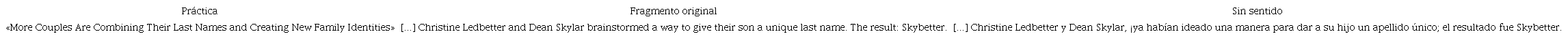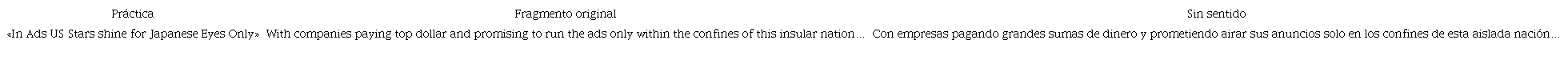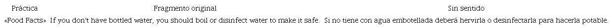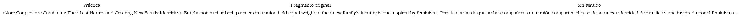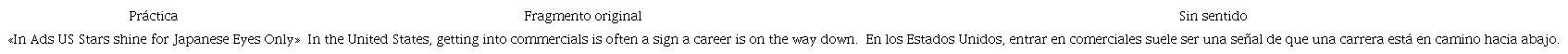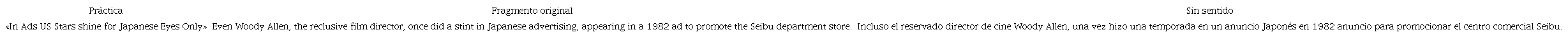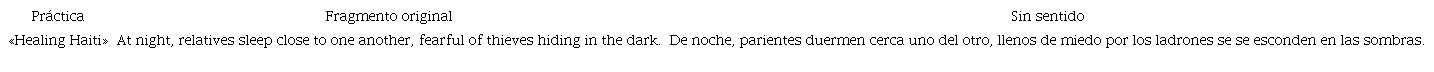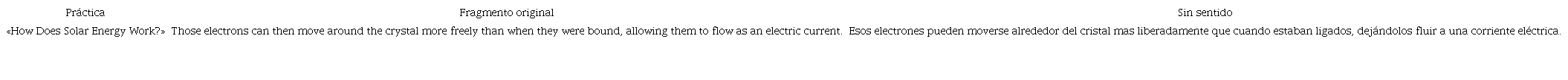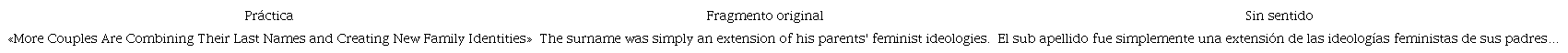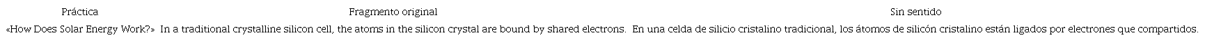 Para explicar las representaciones del sin sentido se opta a continuación por ofrecer una selección de ejemplos representativos de cada categoría. Las tablas que abordamos contemplan el nombre del texto origen en la primera columna, el fragmento del original sujeto al análisis lingüístico en la columna del medio y el fragmento traducido que presenta el sin sentido, en la tercera. Es importante mencionar que en algunos casos se pueden identificar observaciones adicionales a las propuestas en los fragmentos traducidos, sin embargo, hemos decidido centrarnos únicamente en aquellas que provocan desviaciones en la comprensión de la redacción y que son parte constituyente del sin sentido.