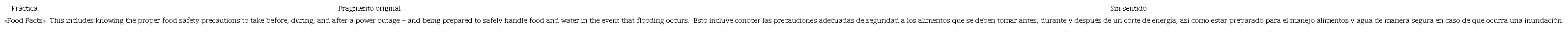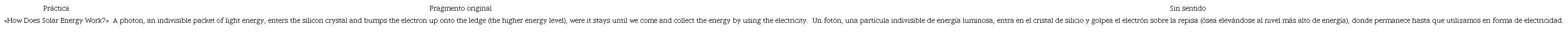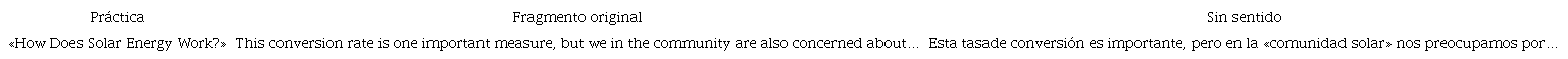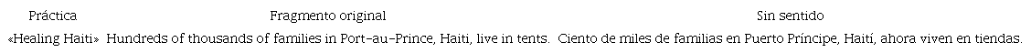 Por otro lado, hemos decidido separar estos hallazgos en una categoría concreta de sin sentido porque encontramos que están relacionados con el ejercicio de la literacidad disciplinar. Lo anterior deviene de que la forma de evitarlos en una versión final es aplicar un proceso de lectura destinado a identificarlos y corregirlos de manera oportuna. Se insiste así en la importancia que posee la autorevisión como parte de la literacidad disciplinar aplicada al proceso traductor, lo cual no ocurre en los siguientes casos.