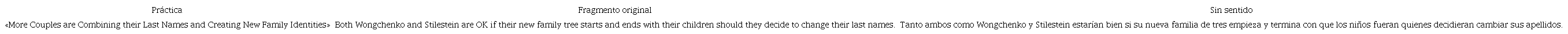 Apoyados en el fragmento original, podemos constatar que dos posibilidades de traducción al español de las secciones destacadas son «Tanto Wongchenko como Stilestein…», o bien «Ambos Wongchenko y Stilestein», sin embargo, la traducción emplea las dos fórmulas al mismo tiempo. No solo no tiene sentido, sino que el segundo sintagma destacado en la traducción se puede considerar un falso sentido (otro de los errores que integran la taxonomía explicada en la obra de Delisle, Lee-Jahnke y Cormier [1999]) caracterizado por ser una desviación hacia algo diferente de lo que se estipula en el texto original, lo cual vemos entre family tree y familia de tres. Esta falta de correspondencia semántica es una evidencia de que existe falta de comprensión del original por parte del traductor, es evidencia también de que los mecanismos de literacidad que se pusieron en práctica no han sido suficientes para producir un fragmento con sentido. También, y como ocurre en el ejemplo anterior, se aprecia la manifestación conjunta de más de un elemento de las categorías que hemos revisado, cuya incidencia provoca un sin sentido.