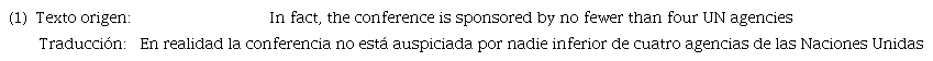 Del ejemplo anterior resulta un sin sentido debido a que, como manifiesta el concepto, la traducción constituye una formulación absurda, una expresión que queda a deber naturalidad en lengua meta. Se apoya en lo que agregan Delisle, Lee-Jahnke y Cormier (1999) al decir que «el sin sentido se debe a una mala interpretación o a un error metodológico y pone de manifiesto una falta de reflexión o un error de juicio por parte del (traductor) o del estudiante» (p. 288). Dicho error de juicio se materializa en la elección de la expresión «no está auspiciada por nadie inferior de», que además de contener un solecismo2 en el uso de la preposición, complejiza la comprensión del mensaje. En este respecto, la solución que los autores proponen es: «En realidad no menos de cuatro agencias de las Naciones Unidas auspician la conferencia» (p. 288). Es conveniente destacar que, para Jean Delisle, este es el error de sentido de mayor gravedad (Delisle, Lee-Jahnke & Cormier, 1999).