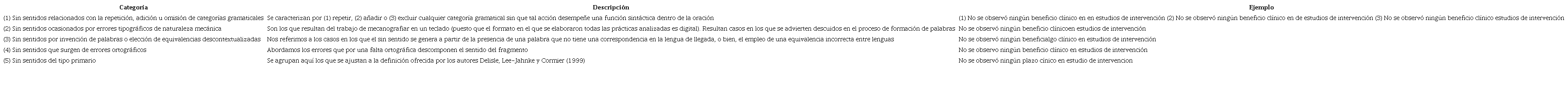 Es así que, como resultado de estas consideraciones y bajo el amparo de las observaciones realizadas a partir del análisis, hemos identificado manifestaciones de lo que explican Delisle, Lee-Jahnke y Cormier, lo cual en este estudio denominamos sin sentidos del tipo primario, para distinguirlos de otras representaciones del sin sentido que también hemos encontrado presentes en el corpus. Estas otras manifestaciones del error comparten con lo establecido por los autores la característica fundamental del sin sentido: hacer que un fragmento traducido sea difícil de leer y comprender, no solo porque es absurdo sino también por otros aspectos que dan origen a las categorías que se presentan a continuación. Desde esta perspectiva, no planteamos una redefinición del sin sentido, sino una visión ampliada de este.