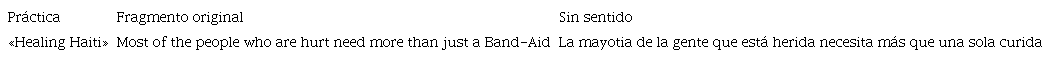 Como se aprecia, ambos casos presentan errores en la morfología de las palabras empleadas que se relacionan con errores de mecanografía computarizada. En la Tabla 7 observamos la omisión de la s al final del sustantivo numeral cientos de miles, que es una clara equivalencia de hundreds of thousands. Por su parte, en la Tabla 8, la construcción de las palabras mayoría y curitas3 es descuidada en la traducción, donde aparecen mal escritas.