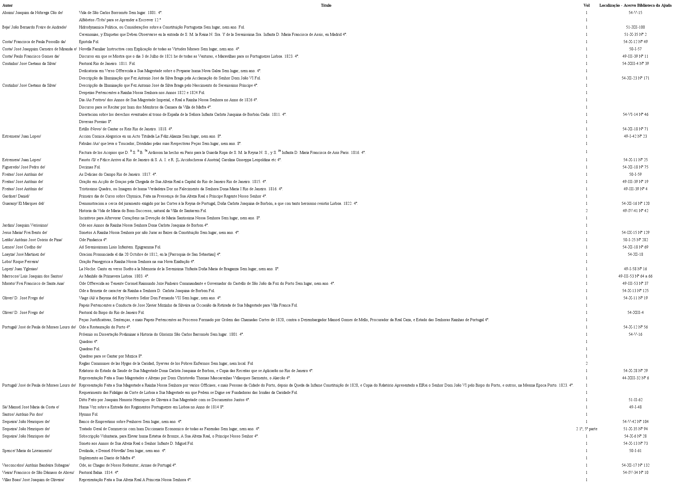 Aboim/ Joaquim da Nóbrega Cão de/ | Elogio Historico do Serenissimo Senhor Infante Dom Pedro Carlos de Bourbon e Bragança [Almirante General da Armada Real Portugueza. Composto, e Dedicado ao Principe Nosso Senhor o Senhor Dom João, Principe Regente de Portugal e das Conquistas] Rio de Janeiro. 1813. 4°. | 1 |